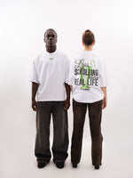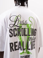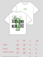 Esta pieza toma la estética clásica del streetwear y le da un giro con símbolos que hablan de conquista, conexión y pausa. El bordado frontal ASCDNT en verde vibrante enmarca el mensaje: avanzar, pero con sentido. En la espalda, dos elementos marcan el ritmo de esta temporada: el trofeo mas deseados por todos impreso en serigrafía verde (ícono de logros personales) y el mensaje "Less scrolling, more real life", en serigrafía puff negra, como un recordatorio directo.